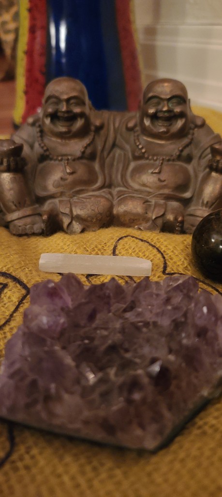 A scarf from a sister-friend served as my altar’s foundation. Upon it, I sat a bronze statue of two fat, laughing Buddhas with their arms around each other. Jacob and I got that as a symbol of our relationship to sit on the first alter we ever created before getting Reiki trained more than a decade ago while healing from the loss of our first miscarriage. One of my intentions for this journey was relationship healing, as we aren’t the same people, and our relationship looks slightly different than it did before Covid. This statue was to remind me of that intention. I also brought some of my favorite crystals and Oracle decs, because they always bring me comfort.