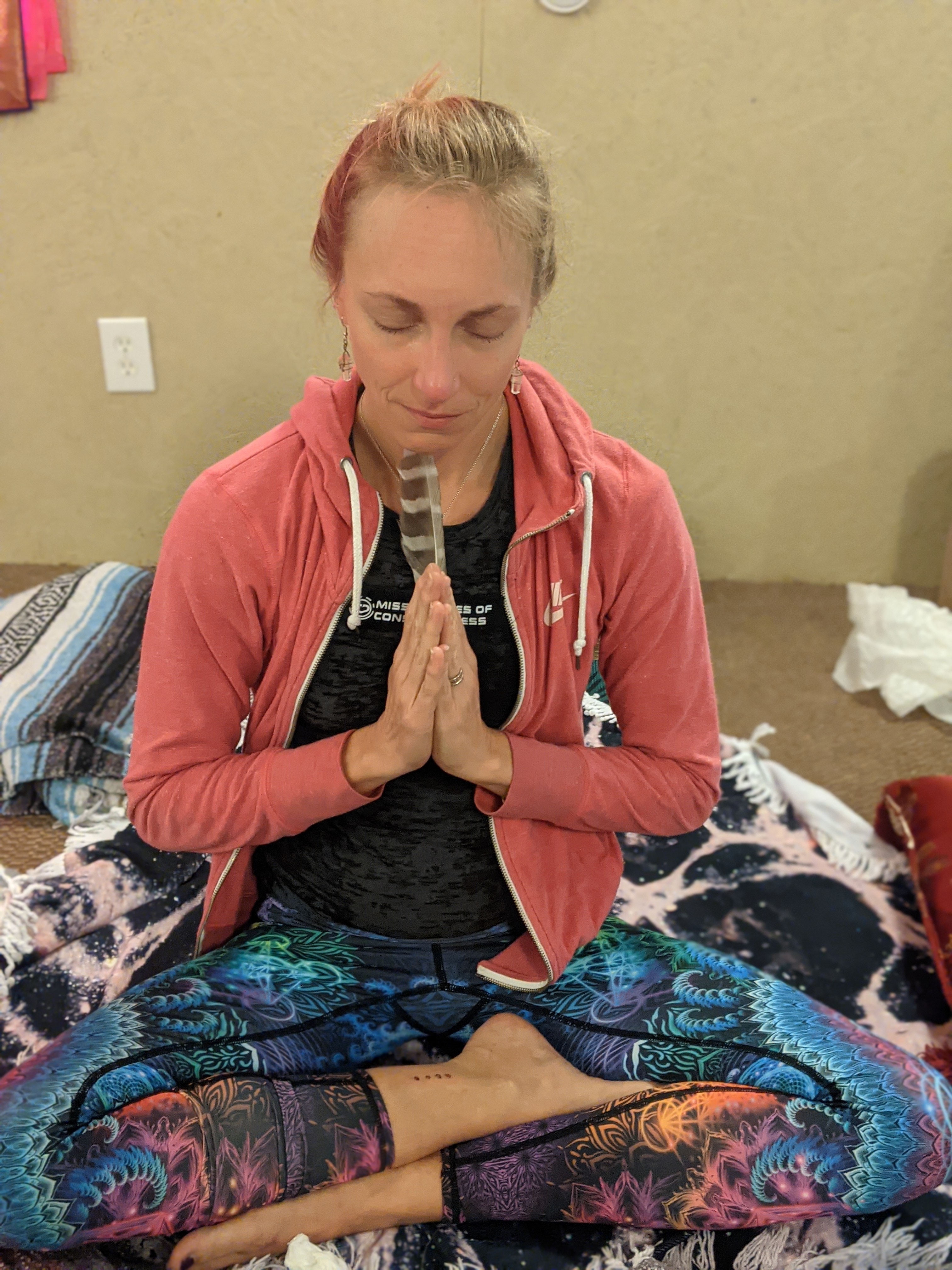 We were instructed to bring anything we wanted for our comfort, so we brought stuff to create a pallet on the floor. However, I took it a step farther. After reading “How to Change Your Mind,” I started doing my own mini-rituals before every private psychedelic journey (aka, at-home-date-nights) Jacob and I would take together. Taking time to intentionally connect with the Divine beforehand, profoundly improved my experiences. When I call upon the Goddess, she shows up. Brilliant! And so, I created a mini alter next to my pallet to help energetically support this new expierence.