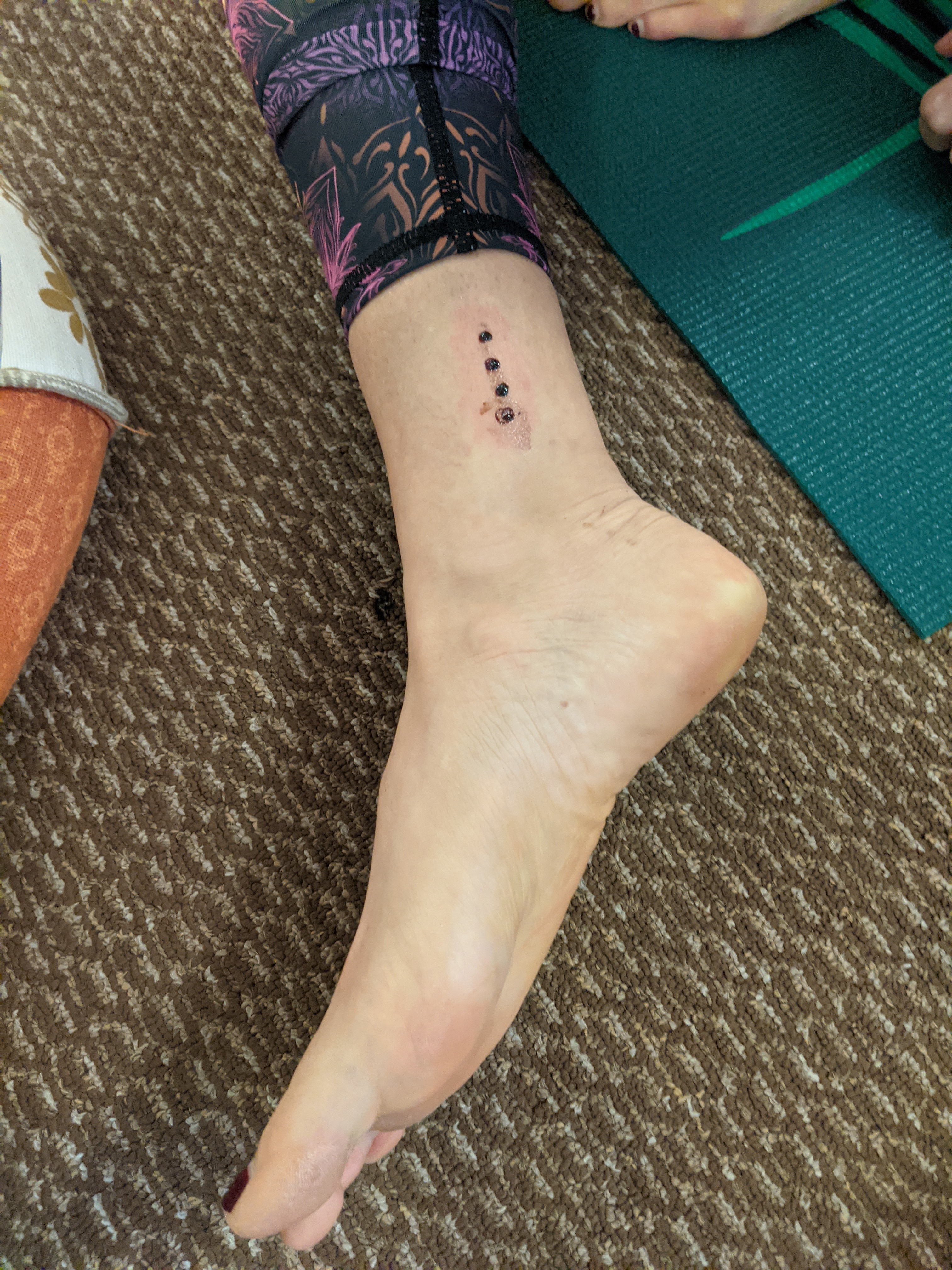 I was also crazy-grateful that I had my first Kambo session the week prior. Kambo is a healing ritual used mainly in South America. It’s named after the poisonous secretions of the giant monkey frog, or Phyllomedusa bicolor. The frog secretes the substance as a defense mechanism to kill or subdue animals that try to eat it. Indigenous people have used kambo for centuries to heal and cleanse the body by strengthening its natural defenses. This medicine is applied topically. First, my medicine woman took a lighter to the end of a small wooden stick. When it was hot enough, she pushed the fiery stick onto my skin, opening the gates, and created 4 small burns on my ankle. She wiped the burns with a wet cloth, cleaning them before applying the medicine. As she applied it, I drank two huge glasses of water.
